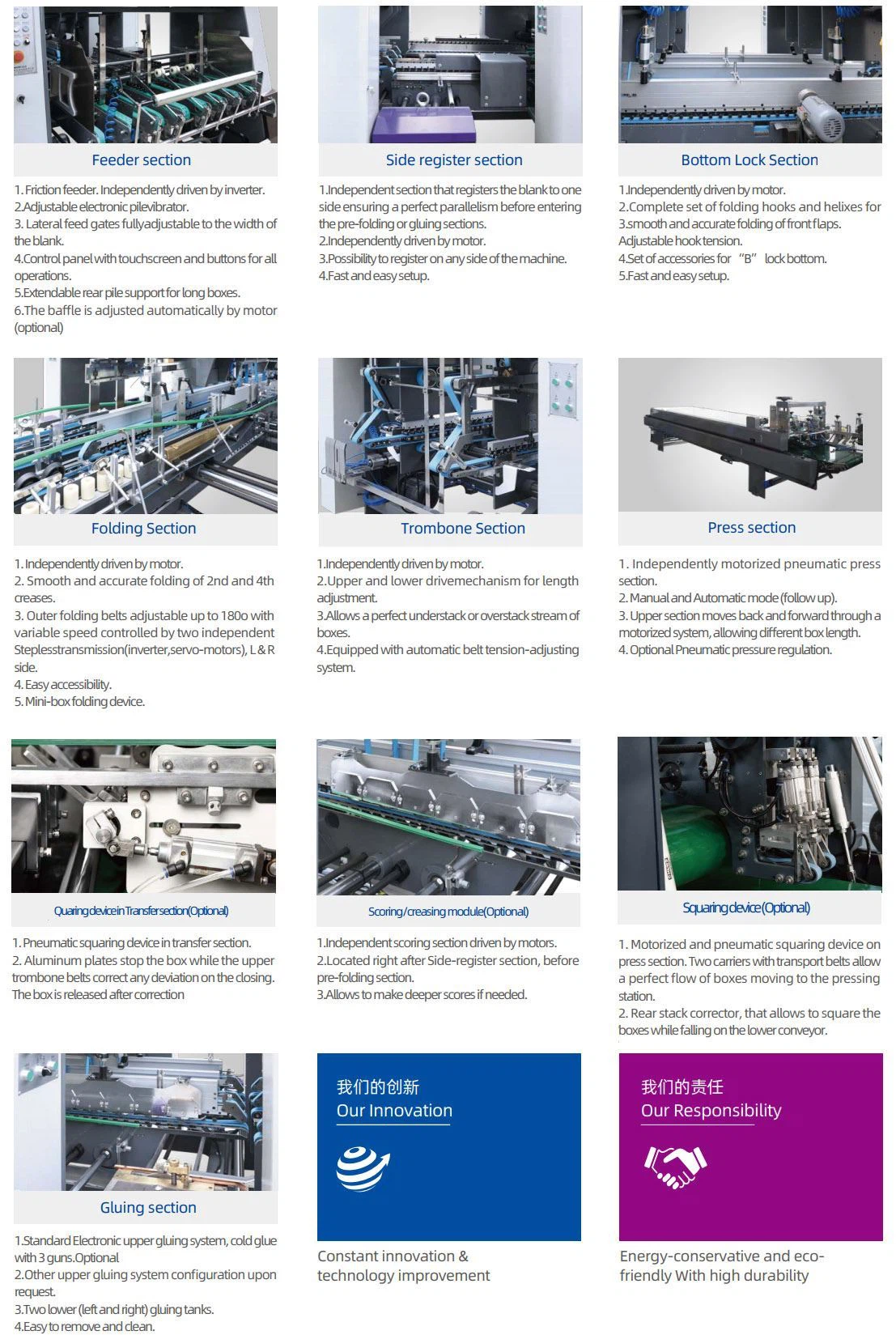 Automatic Folding And Gluing Machine is a multi function model, which is suit for card board, EB flute corrugated board. This model has corectiondevice.Can select bottom lock device..Can make electrical adjusting. Has UV destroying device and dust removing device for better gluing effect.